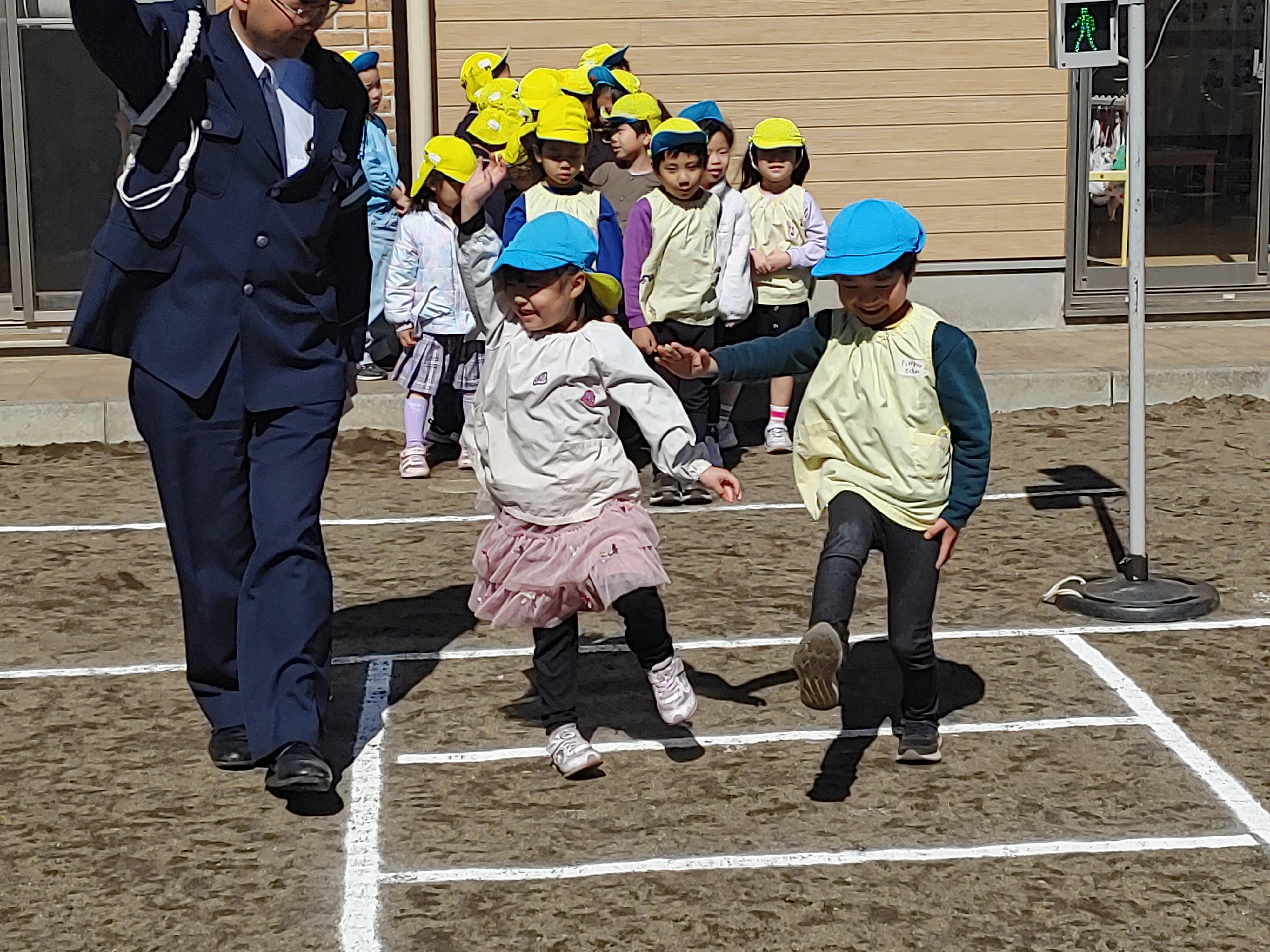 後半は園庭に移動し、年長ふじ組を対象に、道路を渡る練習を行いました。